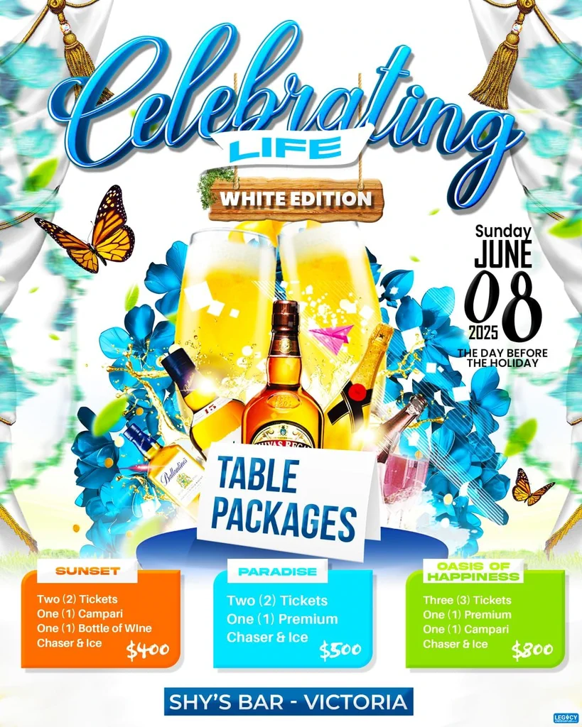 Celebrating LifeShareDate: June 8, 2025TicketsGeminiEC: $ 100Sunset Table PackageEC: $ 120Ticket OutletsChucky’s BarShy’s BarLicks & BitesMelo’s BarBogozo Barber ShopFood InclusiveMore events like this Share